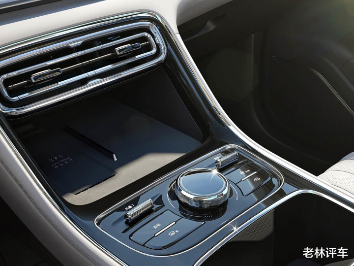 前排地台上,可以看到50W手机无线充电面板,它的换挡机构位于方向盘右侧底部,采用了电子怀挡的形式。